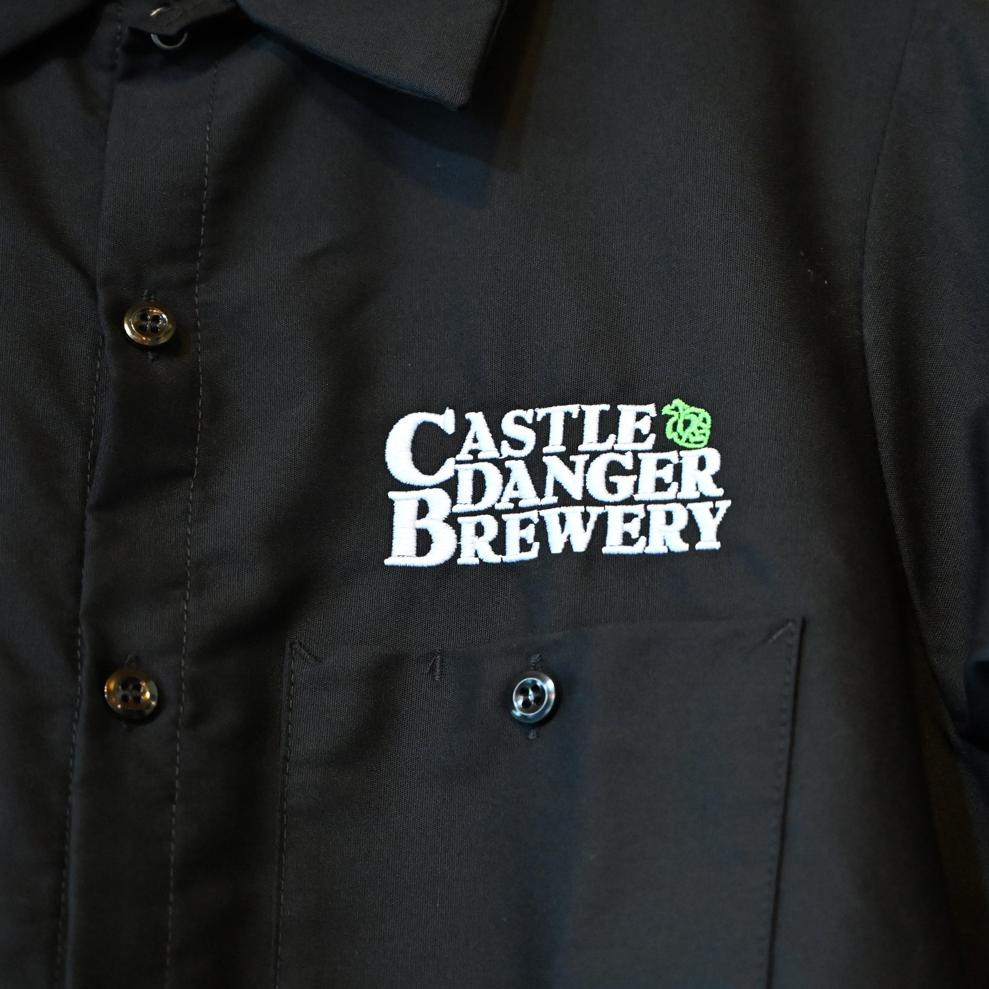A durable, classic work shirt featuring a structured collar and two front pockets. The Castle Danger Brewery hop logo is embroidered above the left pocket, and the back showcases a bold white Team Danger logo.