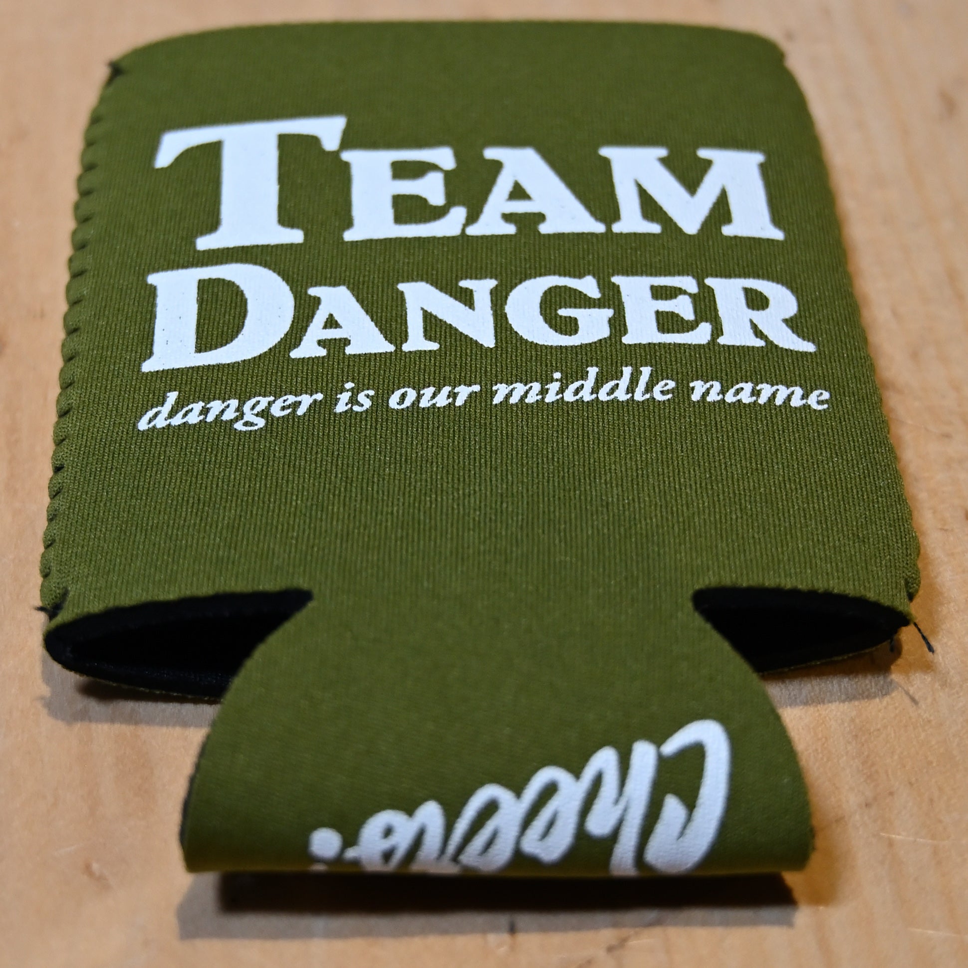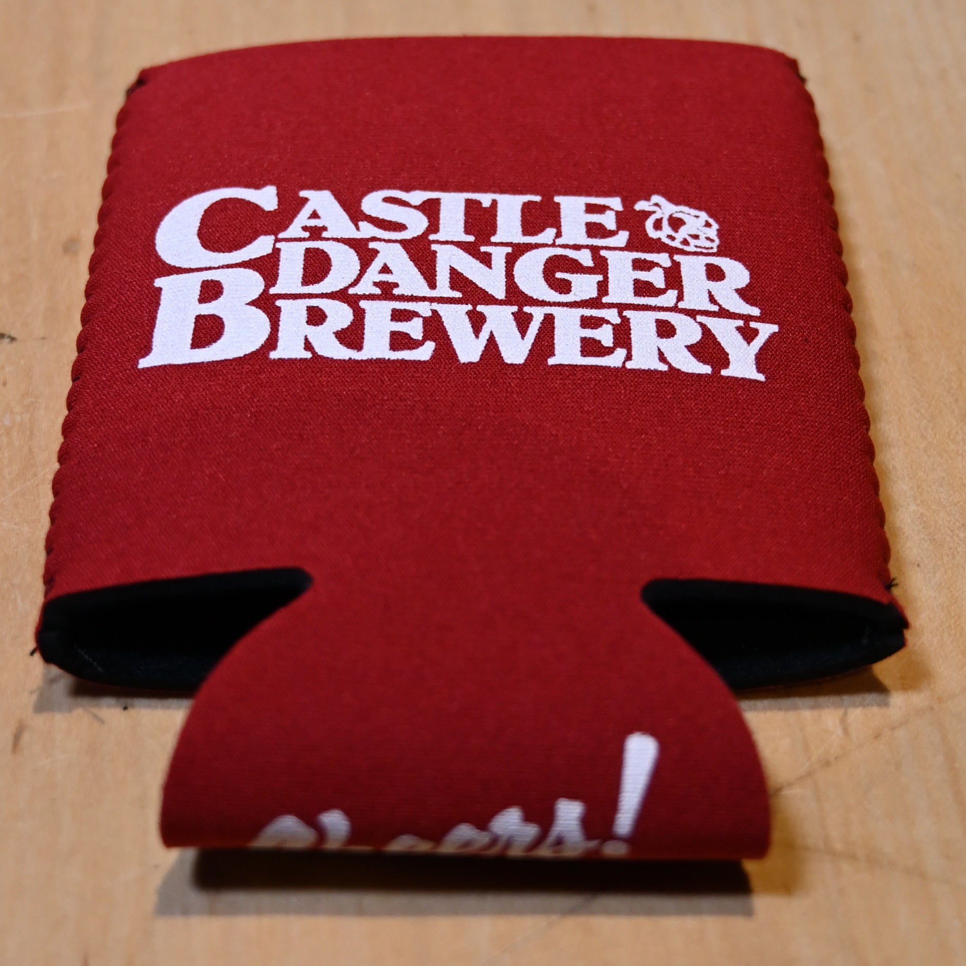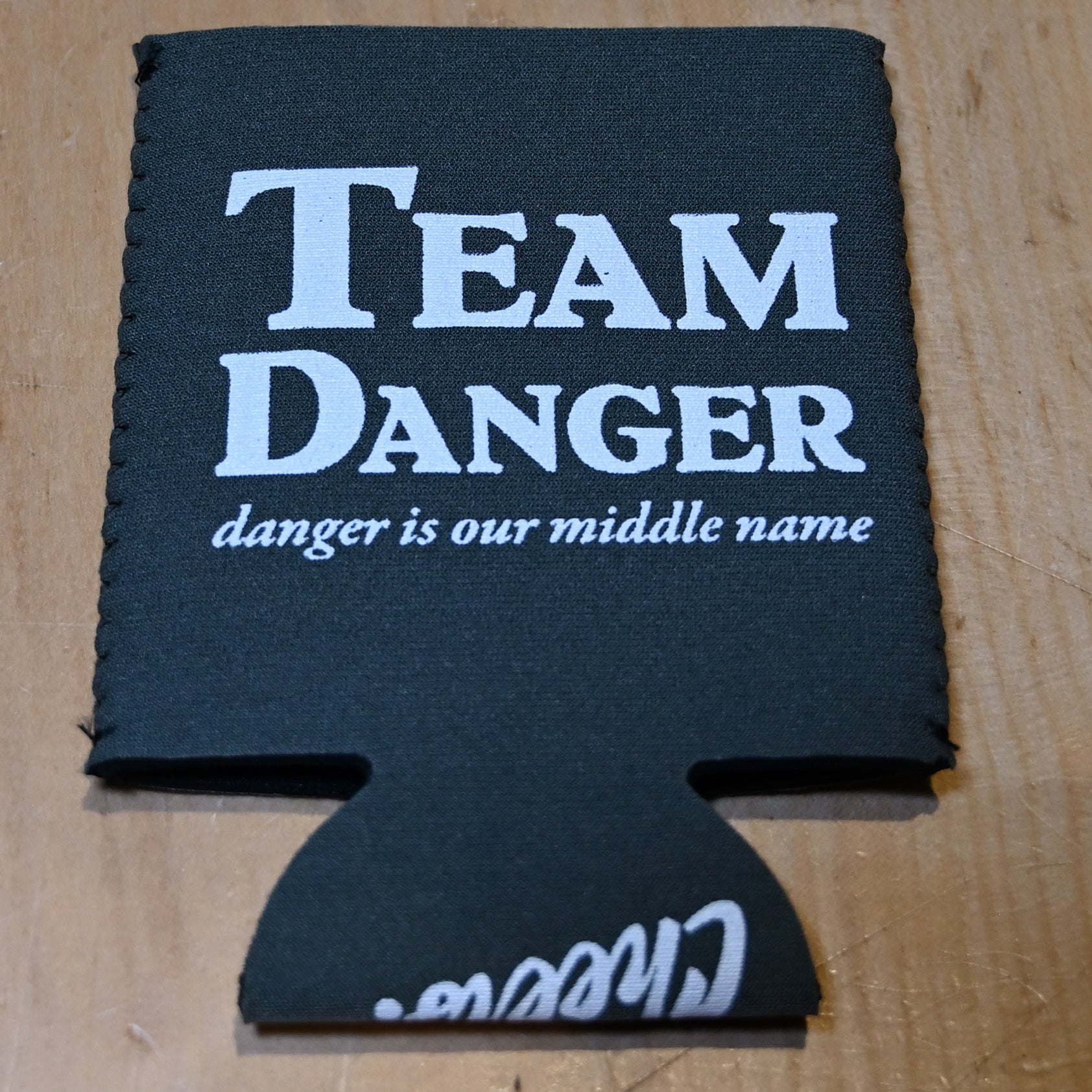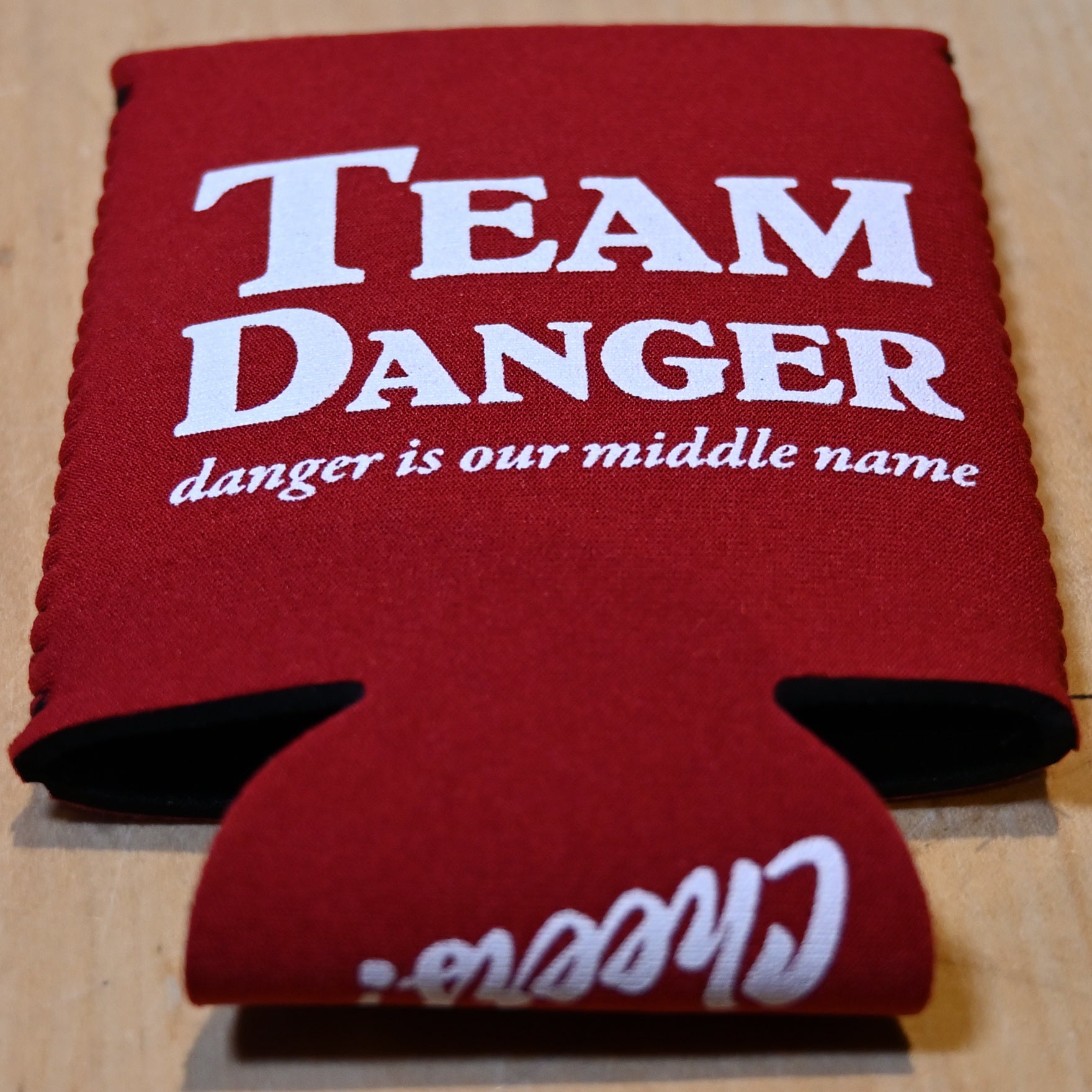 Can Coolies with Castle Danger Text Logo on front and Team Danger Logo on back with Cheers! on the bottom